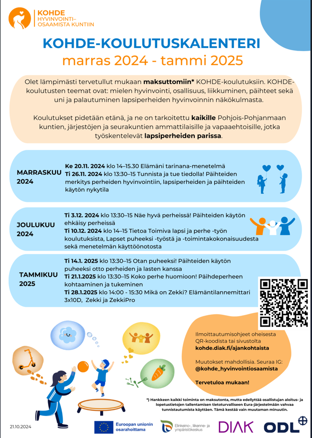Lataa linkistä koulutusesite marras-tammikuulle. Esitettä saa vapaasti jakaa verkostoihin ja laittaa ilmoitustauluille. Esitteen voi ladata täältä: KOHDE-koulutusjuliste marras 2024 – tammi 2025